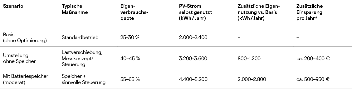 Eine Beispielrechnung zeigt, wie stark sich der Eigenverbrauch einer PV-Anlage im Bestand je nach Maßnahme erhöht und welche Größenordnung an jährlicher Einsparung realistisch ist.