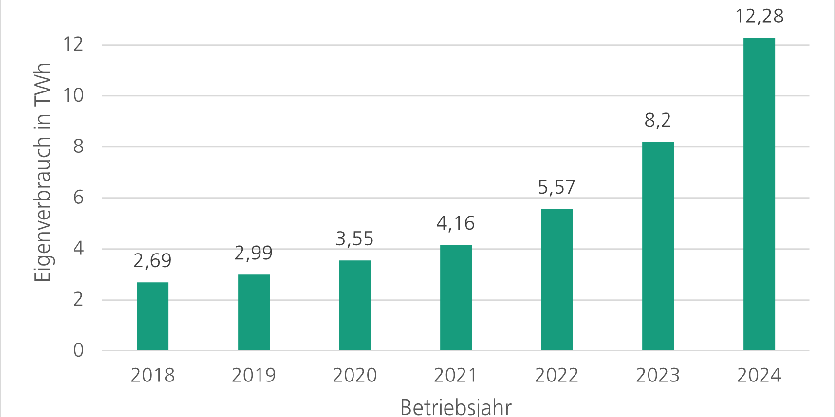 Der wirtschaftlich motivierte Eigenverbrauch von Solarstrom hat in Deutschland in den letzten Jahren stark zugenommen. Nach Daten des Fraunhofer-Instituts für Solare Energiesysteme ISE stieg der Eigenverbrauch von PV-Strom von 3,55 TWh im Jahr 2020 auf 12,28 TWh im Jahr 2024. Damit entfielen 2024 bereits rund 17 % der gesamten Photovoltaik-Stromerzeugung auf direkten Eigenverbrauch – gegenüber 13 % im Jahr 2023.